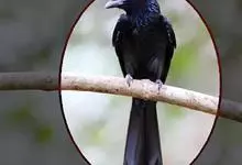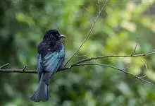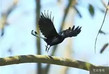 发冠卷尾是中型鸟类,体长28-35厘米。通体绒黑色缀蓝绿色金属光泽,额部具发丝状羽冠,外侧尾羽末端向上卷曲。栖息于海拔1500米以下的低山丘陵和山脚沟谷地带,多在常绿阔叶林、次生林或人工松林中活动。…全部>>