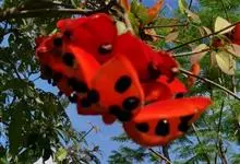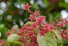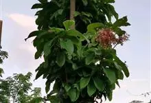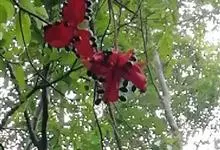 假苹婆是锦葵科苹婆属乔木植物。幼枝被毛;叶椭圆形或披针形,先端骤尖,基部钝或近圆无毛;圆锥花序腋生,花淡红色;蓇葖果鲜红色,长卵圆形或长椭圆形;种子卵圆形黑褐色;花期4-6月。…全部>>