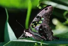 青带凤蝶Graphium sarpedon ,又名青凤蝶,是最普遍的中型凤蝶,飞行速度很快。青带凤蝶的翅膀中央有许多浅蓝色的斑点,很整齐地排列成一条直线。这些斑点由上而下逐渐变大,就像一条青色的带子。全部>>