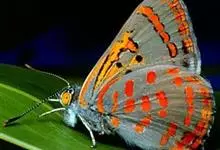 优红蛱蝶:翼展4.5-12厘米。是一种美丽的蝴蝶。色彩鲜艳,花纹相当复杂。前足相当退化,短小无爪。前翅R脉5条,常共柄。卵呈半圆球形。幼虫头上常有突起,体节上有枝刺,腹足趾钩1至3序中列式。蛹为垂蛹。全部>>