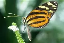 虎斑蝶,Danaus genutia ,是斑蝶属的一种,常见于湿地公园内。雄性虎斑蝶经常伏于吊裙草 上吸食汁液,以制造吸引异性的香气。虎斑蝶翅膀腹面鲜橙色,翅脉和翅边缘黑色,边缘上有两行小白点,…全部>>