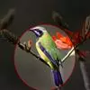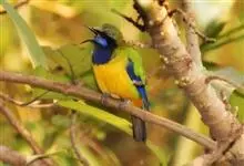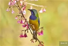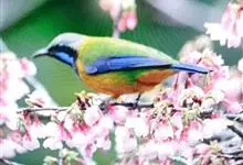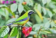 橙腹叶鹎体形大小和金额叶鹎相似,体长16~20厘米。额至后颈黄绿色,其余上体绿色,小覆羽亮钴蓝色,形成明显的肩斑。颏、喉、上胸黑色具钴蓝色髭纹,其余下体橙色。飞羽和尾羽雄鸟黑色、雌鸟绿色。…全部>>