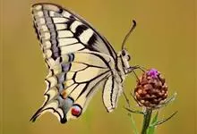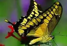金凤蝶,是鳞翅目凤蝶科凤蝶属动物。金凤蝶为中型凤蝶,翅展70-84毫米,翅背面底色黑褐色,翅脉黑色,翅室具黄斑;前翅背面基部呈暗黄色,亚外缘为黑色,内具一列小黄斑;后翅背面亚外缘区具黑宽边,…全部>>