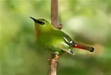火尾绿鹛是莺科、绿鹛属小型鸟类,体长11-14厘米。上体绿色,头顶至枕具黑色鳞状斑,眼先和眼后黑色,眉纹黄绿色。两翅黑色具黄色和红色翅斑及白色端斑,极为醒目。中央一对尾羽绿色,外侧尾羽鲜红色。…全部>>