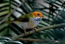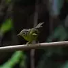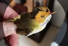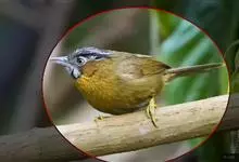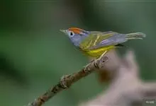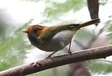 棕脸鹟莺:体长10厘米,是一种色彩亮丽而有特色的莺鸟。头栗色,具黑色侧冠纹。上体绿,腰黄色。下体白,颏及喉杂黑色点斑,上胸沾黄。与栗头鹟莺的区别在头侧栗色,白色眼圈不显著且无翼斑。…全部>>