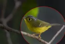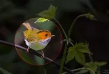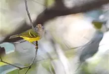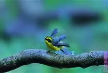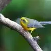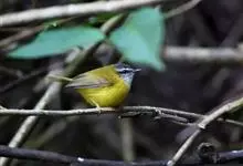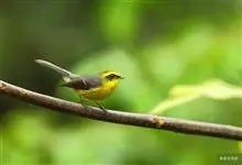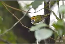 黑脸鹟莺:体长10厘米,是有特色的体小而多彩的莺鸟。粗眉纹,颏、喉及尾下覆羽黄色,脸罩黑,头顶及颈背灰色,上体绿,无翼纹,腹白。虹膜褐色;上嘴色深,下嘴肉色;脚偏绿色。…全部>>