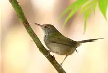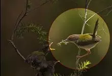 普通缝叶莺,是雀形目鹅科莺亚科缝叶莺属一种。体长10-14厘米,体重7-10克,雄鸟前额棕红,头顶至枕棕橄榄褐,上体橄榄绿染黄,飞羽及尾羽暗褐;繁殖期雄鸟的中央尾羽特形延长,下体淡皮黄白色。…全部>>