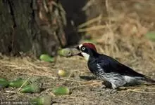 橡树啄木鸟:体长20-23厘米。前额灰黄色,头顶、后颈红色。喉下部、腰和腹部白色,腹部有细的黑色纵条纹。其余体羽为黑色。嘴黑色。腿、脚暗灰色。栖息于山区林地中。结群活动。以昆虫以及植物坚果、果实等为食。…全部>>