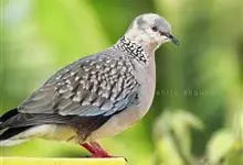 珠颈斑鸠,别名花斑鸠、珍珠鸠、花脖斑鸠、鸪鹪,是鸠鸽科副斑鸠属鸟类。体型中等,体长27~34cm,体重120~205g,雌鸟和雄鸟羽色相似,但雌鸟不如雄鸟羽色亮泽。珠颈斑鸠前额至头顶羽色稍淡,…全部>>