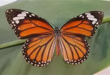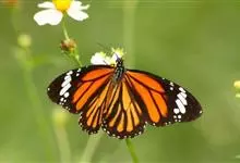 黑脉金斑蝶:翅阔8.6-12.4厘米。雄蝶较雌蝶为大。成年蝶颜色鲜艳,翅膀上有显眼的橙色及黑色斑纹,周围是宽阔的黑色边框,布有许多白色斑点。这种引人注目的着色是对捕食者的视觉警告,表示这个物种有毒;…全部>>