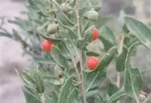 枸杞,又称宁夏枸杞、中华枸杞等。茄科枸杞属多年生木本植物,枝条细弱,弓状弯曲或俯垂,淡灰色;叶片呈卵形;花长在长枝上单生或双生于叶腋;果实为卵状浆果红色;花期为6~7月;果期为8~10月。…全部>>