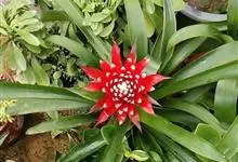 水塔花 Lindl.)是凤梨科水塔花属多年生草本植物;花穗状花序,直立,叶片披针形,花冠鲜红色,花瓣外卷,边缘带紫;果为浆果;莲座状叶丛基部形成贮水叶筒较大,叶片肥厚宽大。花期在六至十月。…全部>>