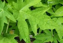 番木瓜,番木瓜科番木瓜属的常绿软木质小乔木,高达10米,具有乳汁;茎不分枝或有时于损伤处分枝;叶大且聚生于茎顶,近似盾形,叶柄中空;花单性或两性,有些品种雄株偶尔生两性花或雌花,…全部>>