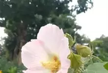 木芙蓉,锦葵科木槿属落叶灌木或小乔木。小枝上有细绒毛;叶片为卵状心形,托叶为披针形,常早落;花单生,花萼为钟形,花冠初为白色或淡红色,后逐渐变为深红色;果实为扁球形,有淡黄色的毛附着。花期8到10月。…全部>>