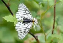 冰清绢蝶:是绢蝶科、绢蝶属的一种蝴蝶。翅展60-70毫米。翅白色,翅脉灰黑褐色。前翅中室内和中室端各有1个隐显的灰色横斑;亚外缘带与外缘带隐约可见,灰色。后翅内缘有1条纵的宽黑带。翅反面似正面。…全部>>