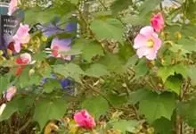 木芙蓉,锦葵科木槿属落叶灌木或小乔木。小枝上有细绒毛;叶片为卵状心形,托叶为披针形,常早落;花单生,花萼为钟形,花冠初为白色或淡红色,后逐渐变为深红色;果实为扁球形,有淡黄色的毛附着。花期8到10月。…全部>>