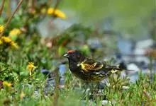 红额金翅雀:共有14个亚种。小型鸟类,体长12-14厘米。额、脸颊和颏朱红色,眼先和眼周黑色,在淡色的头部极为醒目。上体灰褐或乌褐色,尾上覆羽白色,两翅和尾黑色,翅上有黄色斑。下体喉、胸灰褐或乌褐色…全部>>