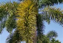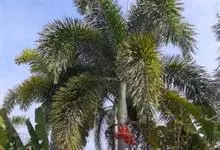 狐尾椰是棕榈科狐尾椰属的常绿乔木;木植高大通直,茎干单生,茎部光滑,有叶痕,略似酒瓶状;叶色亮绿族生茎顶,羽状全裂,小叶披针形,轮生于叶轴上,形似狐尾;穗状花序,分枝较多;雌雄同株;果卵形,…全部>>