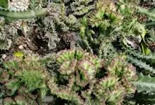 布纹球,是大戟科大戟属植物。植株小球形,表皮灰绿色,中有红褐色,顶部条纹较密;棱缘上褐色小钝齿;雌雄异株,雌株球体较扁,雄株茎圆筒形,均为单生球。开花,花极小,黄绿色;盛花期,夏季;球表皮灰绿色,…全部>>
