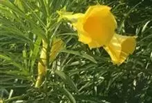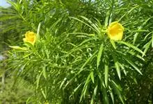 黄花夹竹桃K. Schum.),又名“酒杯花”“柳木子”“黄花状元竹”,是夹竹桃科,黄花夹竹桃属下的常绿乔木植物。高达5m,全株无毛,树皮棕褐色;叶互生,近革质,线形或线状披针形;花大,黄色,具香味,…全部>>