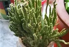 筒叶花月,是景天科青锁龙属的多年生草本植物。植株多分株,灌木状,茎较粗壮,圆柱形,表皮灰褐色;叶片肉质,互生,呈圆筒状,簇生于茎或分枝顶端,叶端呈斜截形,截面为椭圆形;花呈星状,淡白色;花期秋季。…全部>>