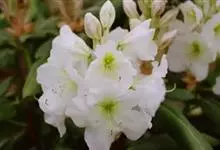大白杜鹃是杜鹃花科杜鹃花属的常绿灌木,高可达5米。幼枝绿色,无毛;叶厚革质,长圆形或圆状倒卵形,先端钝或圆,基部楔形;总状伞形花序顶生,花序轴疏生白色腺体,花梗粗,具白色有柄腺体,冠宽漏斗状钟形,…全部>>