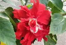 重瓣朱槿是锦葵科、木槿属常绿灌木植物;小枝疏被星状柔毛单叶互生,卵形或卵状披针形,基部圆形;叶柄长;托叶早落;花重瓣,较朱槿为大;花萼小,钟形,基部具有苞片多枚;花瓣多枚排列成彩球状,…全部>>