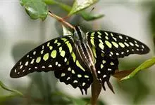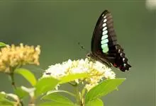 青带凤蝶Graphium sarpedon ,又名青凤蝶,是最普遍的中型凤蝶,飞行速度很快。青带凤蝶的翅膀中央有许多浅蓝色的斑点,很整齐地排列成一条直线。这些斑点由上而下逐渐变大,就像一条青色的带子。全部>>