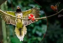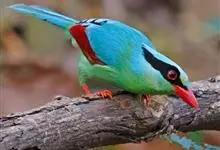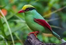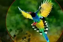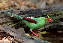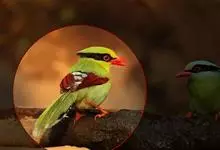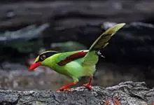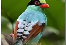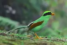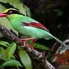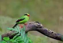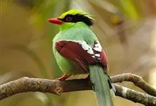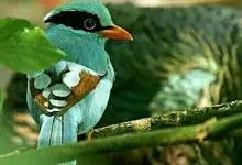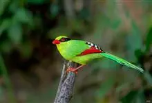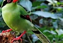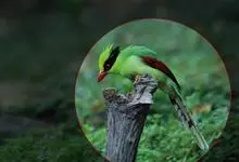 蓝绿鹊:中型鸟类,共有5个亚种。体长36-38厘米。尾长,嘴、脚红色。通体羽色主要为草绿色,宽阔的黑色贯眼纹向后延伸到后颈,在绿色的头侧极为醒目。两翅栗红色,内侧飞羽具黑色次端斑和白色尖端。尾绿色,…全部>>
