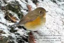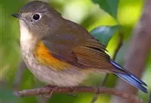红胁蓝尾鸲俗名:蓝点冈子、蓝尾巴根子、蓝尾杰、蓝尾欧鸲。体型略小而喉白的鸲。特征为橘黄色两胁与白色腹部及臀成对比。雄鸟上体蓝色,眉纹白;亚成鸟及雌鸟褐色,尾蓝。…全部>>