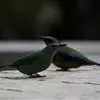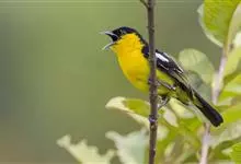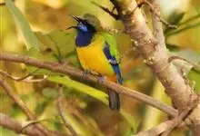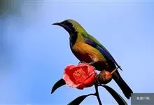 蓝翅叶鹎:小型鸟类,体长15-18厘米。雄鸟通体草绿色,尾蓝绿色,肩和翅亮蓝 色,胸缀有黄色,颏、喉黑色。雌鸟颏,喉蓝绿色。栖息在海拔1500米以下的常绿阔叶林、次生林和林缘疏林灌丛中。…全部>>