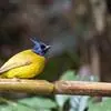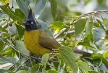 黑冠黄鹎:体长18-21厘米,是一种中等体型偏黄色鹎。整个头、颈、颏、喉黑色,头顶有显著直立的羽冠,黑色,上体褐橄榄黄绿色,下体橄榄黄色。虹膜偏红;嘴及脚黑色。…全部>>