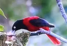 朱鹂:中等鸟类,体长23-28厘米。雄鸟绛紫红色,头、上胸及翼黑色。雌鸟上背及背部深灰色,尾覆羽及尾绛紫红色,腹部及下胸白而密布黑色纵纹。与鹊色鹂幼鸟的区别在上背灰色较深,下体白色较少且纵纹较粗。…全部>>