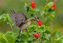 黄腰太阳鸟共有16个亚种,小型鸟类,体长10-15厘米。嘴细长而向下弯曲,雄鸟额和头顶前部金属绿色,头顶后部橄榄褐色。其余头、颈、背、肩、颏、喉、胸以及翅上中覆羽和小覆羽概为红色,腰黄色,…全部>>