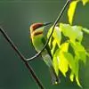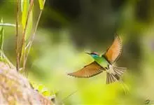 栗喉蜂虎是蜂虎科蜂虎属的鸟类。有热带鸟类羽毛艳丽的特征:喉部是栗红色的,黑色的过眼纹,翅膀和背部是绿色的,尾翼是蓝色的,飞行时翅膀下面的羽毛是橙黄色的,在阳光的照射下,它们全身闪烁着金属般的艳丽光泽,…全部>>