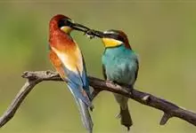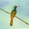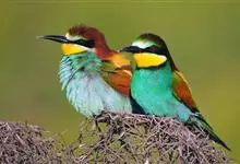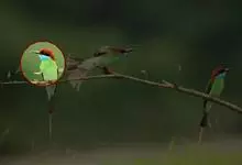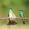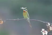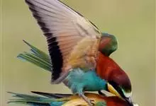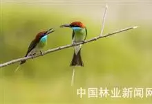 栗喉蜂虎是蜂虎科蜂虎属的鸟类。有热带鸟类羽毛艳丽的特征:喉部是栗红色的,黑色的过眼纹,翅膀和背部是绿色的,尾翼是蓝色的,飞行时翅膀下面的羽毛是橙黄色的,在阳光的照射下,它们全身闪烁着金属般的艳丽光泽,…全部>>