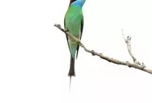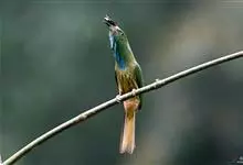 蓝喉蜂是蜂虎科蜂虎属鸟类。体长26-28厘米,嘴长而弯曲,有明显细长的中央尾羽。头部、颈部和背部为巧克力色,有黑色眼纹。喉部、腰部和尾羽为蓝色。腹部和两翼为绿色。幼鸟外观似成鸟,头部、颈部和背部为绿色,…全部>>