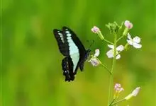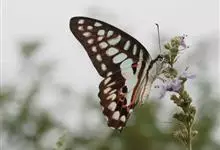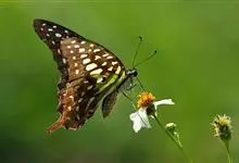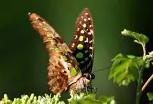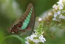 青带凤蝶Graphium sarpedon ,又名青凤蝶,是最普遍的中型凤蝶,飞行速度很快。青带凤蝶的翅膀中央有许多浅蓝色的斑点,很整齐地排列成一条直线。这些斑点由上而下逐渐变大,就像一条青色的带子。全部>>