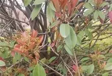 红叶石楠 是蔷薇科,石楠属杂交种,为常绿小乔木或灌木,乔木高可达5米、灌木高可达2米。叶片革质,长圆形至倒卵状、披针形,叶端渐尖,叶基楔形,叶缘有带腺的锯齿,花多而密,复伞房花序,花白色,梨果黄红色,…全部>>