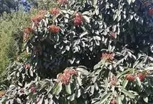 石楠 Kalkman),是蔷薇科石楠属的常绿乔木,高5~12米,株型紧凑,树冠圆球形。树枝为褐灰色;鳞片为褐色,没有毛;叶片革质,长椭圆至侧卵状椭圆形,有锯齿,新叶红色光亮。复伞房花序,白色小花,…全部>>
