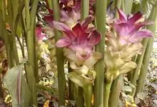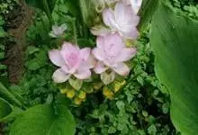 莪术姜科姜黄属多年生草本植物。主根茎陀螺状,淡黄色至白色;叶圆状长圆形至长圆状披针形,中部常有紫斑;花亭自根茎先叶发出,穗状花序阔圆形;苞片卵形,下部绿白色至绿色,上部紫红色;花冠白色或粉红色,…全部>>