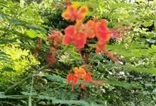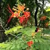 洋金凤 Sw.),豆科小凤花属灌木状或小乔木植物,枝无毛,绿或粉绿色;二回羽状复叶;总状花序伞房状,萼片无毛,花瓣橙红或黄色,圆形,花丝红色,子房无毛,花柱橙黄色;荚果窄而薄,…全部>>