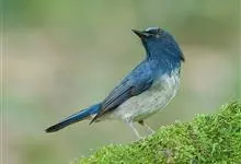 纯蓝仙鹟:体长16-17厘米,体重18-23克。是一种体型略大的浅蓝色或近褐色的鹟。雄鸟上体亮丽钴蓝,眼先黑,喉及胸浅蓝,腹部灰白,尾下覆羽近白。与铜蓝鹟的区别在嘴较长,体羽无绿色,眼圈黄褐。…全部>>