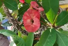 铁海棠为大戟科大戟属蔓生灌木植物;茎多分枝,具纵棱,呈旋转状;叶互生,通常集中于嫩枝上;每个花序基部边缘具微小的红色尖头;苞叶先端圆且具小尖头,无柄,上面鲜红色,下面淡红色;苞片丝状;子房光滑无毛,…全部>>