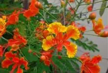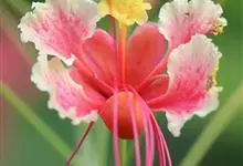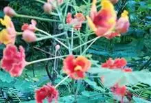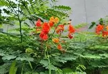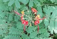 洋金凤 Sw.),豆科小凤花属灌木状或小乔木植物,枝无毛,绿或粉绿色;二回羽状复叶;总状花序伞房状,萼片无毛,花瓣橙红或黄色,圆形,花丝红色,子房无毛,花柱橙黄色;荚果窄而薄,…全部>>