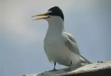 鸥嘴噪鸥,中型水禽,体长31~39厘米。夏羽额、头顶、枕和头的两侧从眼和耳羽以上黑色。背、肩、腰和翅上覆羽珠灰色。后颈、尾上覆羽和尾白色,中央一对尾羽珠灰色。尾呈深叉状。冬羽头白色,头顶和枕缀有灰色…全部>>