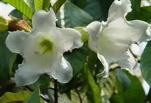 清明花是夹竹桃科、清明花属常绿高大藤本,叶长圆状或倒卵形;聚伞花序顶生,着花3-5朵,有时更多;花大,漏斗形,白色,有香气,花冠5裂片;种子有白色绢质种毛。果期秋冬季。原产云南、印度,…全部>>