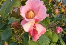 木芙蓉,锦葵科木槿属落叶灌木或小乔木。小枝上有细绒毛;叶片为卵状心形,托叶为披针形,常早落;花单生,花萼为钟形,花冠初为白色或淡红色,后逐渐变为深红色;果实为扁球形,有淡黄色的毛附着。花期8到10月。…全部>>