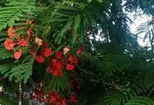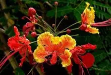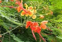 洋金凤 Sw.),豆科小凤花属灌木状或小乔木植物,枝无毛,绿或粉绿色;二回羽状复叶;总状花序伞房状,萼片无毛,花瓣橙红或黄色,圆形,花丝红色,子房无毛,花柱橙黄色;荚果窄而薄,…全部>>