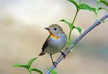 红喉姬鹟小型鸟类,体长11~13厘米。雄鸟上体灰黄褐色,眼先、眼周白色,尾上覆羽和中央尾羽黑褐色,外侧尾羽褐色,基部白色。颏、喉繁殖期间橙红色,胸淡灰色,其余下体白色,非繁殖期颏、喉变为白色。…全部>>
